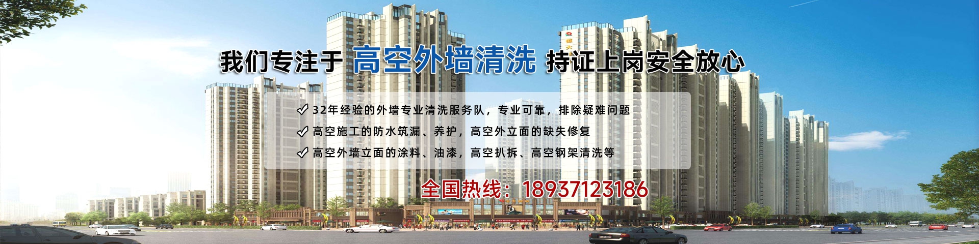 意水清潔 · 業(yè)務(wù)范圍 ———— 有32余年的高空作業(yè)經(jīng)驗(yàn),是全國(guó)同行業(yè)績(jī)?cè)u(píng)比,進(jìn)級(jí)全國(guó)前10強(qiáng)明星企業(yè) ———— |